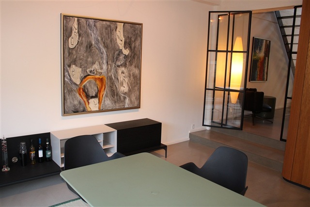 This exceptional two-level apartment is situated within the historic Mineral Water Factory, a building dating back to the 1920s. It masterfully blends contemporary amenities with industrial features and architectural refinement. The residence carries no requirement for permanent registration, and tenants are not permitted to register their address here.Spanning 123 square meters across two floors, the layout presents an intriguing and elegant design marked by timeless appeal. Underfloor heating warms the space, complemented by polished concrete floors on the ground level and wooden flooring on the upper floor. The property also includes a terrace located in a charming atrium courtyard. Upon entering through the main door, one arrives in a spacious open kitchen area boasting luxurious marble countertops and a kitchen island furnished with comfortable bar stools. The same floor also hosts a living and dining room along with a generous bathroom, outfitted with a wall-mounted toilet, a separate shower area featuring a rain shower and unidrain system.