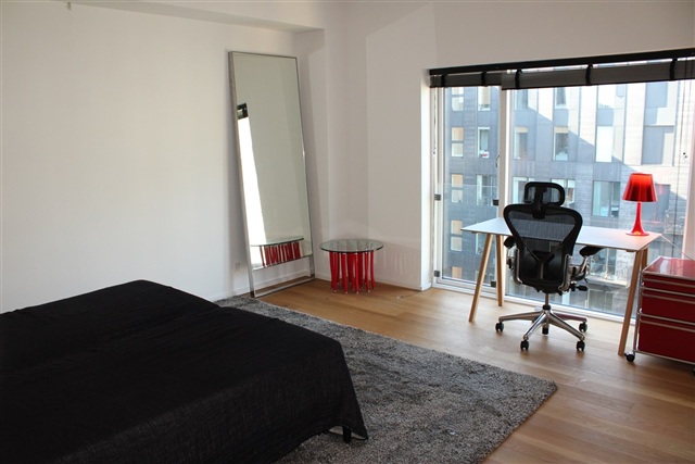 Upstairs, the apartment offers a large open living room with high glass panels overlooking the atrium courtyard and providing views down to the kitchen below. There is also a substantial bedroom equipped with a double bed and ample wardrobe space.