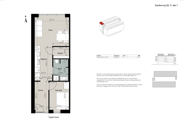 At street level, the building hosts a COOP 365 store, specialty shops, and possibly restaurants, fulfilling everyday needs with convenience and proximity. Above, the residences benefit from ample natural light and expansive windows that provide attractive views. A distinctive corner building, positioned at the junction of Nordre Ringvej and Stadionvej, is clad in reddish-brown materials with built-in planters, offering an architectural highlight. Its rooftop supports 22 two-room apartments that open onto a communal courtyard, which adds greenery and liveliness, enhancing both visual interest and local biodiversity.