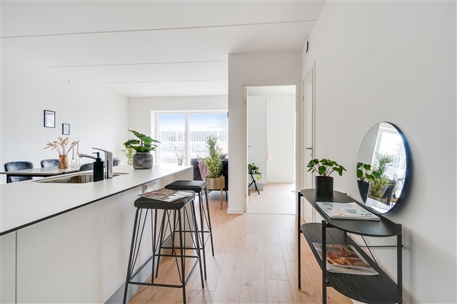 This newly constructed apartment from 2021 offers a refined and modern living space distinguished by bright, high-quality finishes throughout. The residence is part of a larger development characterized by elegant red brick buildings featuring black window frames, a spacious exterior walkway, and elevator access. Situated within a peaceful, gated complex, this home is well-suited for families, couples, or individuals seeking a central location with proximity to numerous amenities. Within a short walking or cycling distance, residents can reach Albertslund Station's S-train, nearby shopping options, as well as schools and childcare facilities.For those who enjoy outdoor activities, nearby Vallensbæk Mose and Tueholmsøen provide inviting green spaces ideal for running or walking. If shopping is preferred, City2 and Waves are easily accessible, and Copenhagen's shops and restaurants can be reached conveniently by S-train or motorway. Upon entering the apartment, an abundance of natural light floods the interiors, thanks to numerous large windows, creating a warm and welcoming atmosphere. The design clearly focuses on establishing a home ready for immediate occupation, adaptable to personal tastes and preferences. Flooring is consistent throughout the rooms, with the exception of the bathroom, which features dark gray tiles that extend into the built-in shower niche. The bathroom is stylishly appointed with a wall-mounted toilet, space for a washer-dryer stack, and sleek white cabinetry without handles, complemented by an integrated sink.