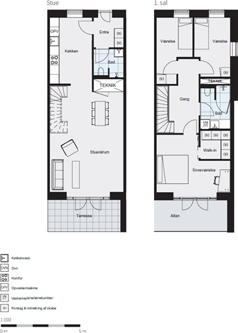 Situated in the sought-after Musicon neighborhood, this distinctive two-story townhouse offers immediate proximity to natural surroundings, nestled between rooftops adorned with grass and expansive green landscapes. Musicon itself is noted for its vibrant urban environment, creative spirit, and convenient closeness to cafés, cultural venues, shops, and the center of Roskilde. The home caters well to family life and a variety of leisure pursuits, whether enjoying sunbathing on the terrace or relaxing in the garden.Upon entering, a welcoming hallway leads you past a bathroom and directly into an open-plan kitchen that extends into a spacious dining area. The large, light-filled living room provides seamless access to a private garden outside. A staircase in the living area ascends to the first floor, where an open landing doubles as a cozy nook and includes ample closet space. Natural light streams through a skylight positioned above the stairs, brightening the entire residence. This landing connects the main bedroom, which opens onto a sun deck on the terrace offering views over the verdant landscape, two additional bedrooms, and a sizeable bathroom. Images and floor plans are provided as guidance.