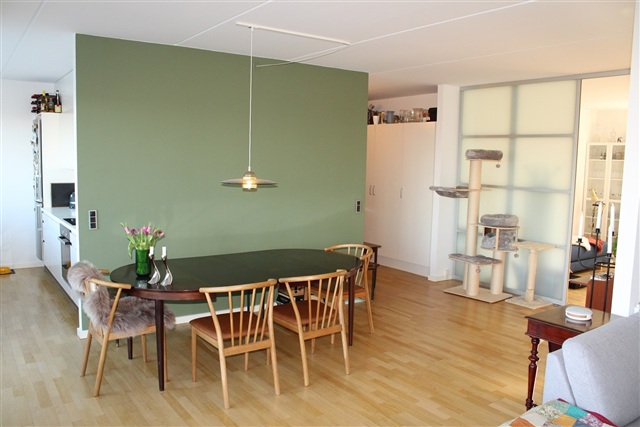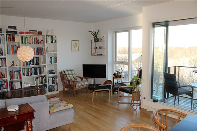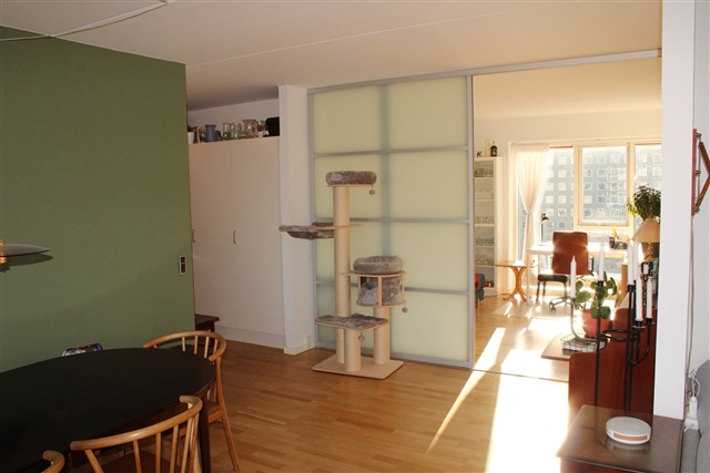 This bright apartment, situated in a modern building completed in 2007 in Ørestad, features two balconies. The central living space is generously sized and naturally divided to accommodate both a dining area and a lounge section with sofas and comfortable armchairs. A bright, open kitchen complements the layout, providing a pleasant view over the green surroundings adjacent to the neighborhood's golf course. The unit includes a spacious bedroom with its own balcony, as well as an additional room fitted with a New York-style sliding door, which can be adapted to serve as a bedroom, office, or an extension of the living area depending on your needs. The bathroom is large and well-equipped, featuring a shower area.Located on the fourth floor, the building offers elevator access and is equipped with a door phone system. Residents benefit from the close proximity to Fields shopping center, reachable within moments, and the nearest metro station is approximately 500 meters from the front door. The landlord exclusively rents to international tenants or expats and does not allow shared housing arrangements.
