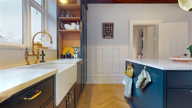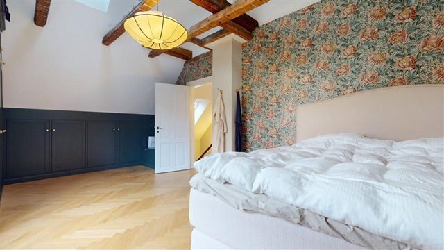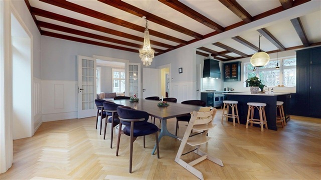 This meticulously renovated villa is situated in a prestigious and sought-after residential area. Positioned within walking distance of a shopping center, train and metro stations, as well as Frederiksberg Garden, the property offers both convenience and charm. The total living space spans 208 square meters across the ground floor and first floor, complemented by a spacious basement of approximately 100 square meters with high ceilings, providing versatile usage options.The enclosed property features a private garden with a gate that grants access to the house, a carport, and a garage located at the rear. Heating is supplied via district heating, and underfloor heating is installed throughout both residential levels. Upon entering, one is greeted by an elegant foyer with a guest toilet. Beyond this lies a large and impressive living room equipped with an open fireplace. The living area connects seamlessly to a dining room and a luxury, open-plan kitchen fitted with all necessary appliances. Adjacent to the kitchen is a substantial room suitable for use as a guest bedroom, home office, or similar purposes.