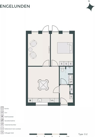 Situated in Viby J, merely 6 kilometers from Aarhus city center, this charming three-room apartment offers a well-organized layout that includes an entrance hall equipped with ample wardrobe space for coats and shoes. The open kitchen and dining area benefits from abundant natural light and is fully furnished with a complete set of modern appliances. A spacious bathroom features light tiles, extensive cabinet storage, a wall-mounted toilet, and a combined washing machine and dryer unit. There are two standard-sized bedrooms, one of which contains built-in closets, and both rooms provide access to the apartment's balcony.Ideal for sharing between two people, a couple, or anyone who desires extra living space, this apartment delivers both comfort and convenience. Engelunden offers excellent bus connections to the city center, and the nearby light rail allows for swift travel to Aarhus C within minutes.