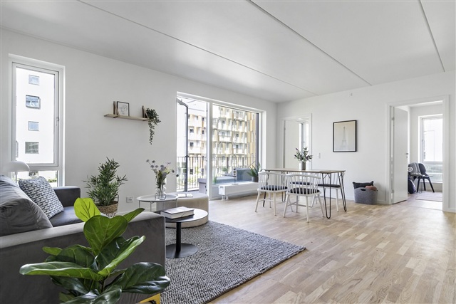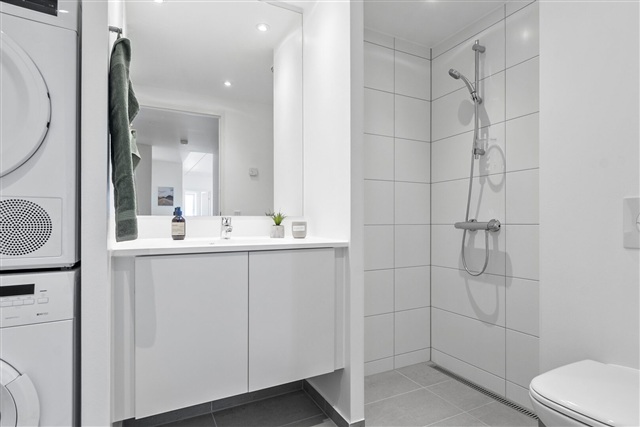 Each apartment features a spacious kitchen and living area designed in an open-plan layout, creating a setting that encourages social interaction and everyday life. The residential complex, known as Havebyen, offers apartments ranging from two to five rooms, catering to a variety of preferences and age groups through its diverse floor plan options.All units share a thoughtfully optimized design and include private outdoor spaces such as terraces, balconies, or roof terraces. The kitchens, equipped by Invita, come complete with full-sized white goods. These open kitchens seamlessly connect to the living rooms, enhancing the sense of openness. Bathrooms are generously sized, featuring large shower enclosures alongside Siemens washer and dryer units. Both bedrooms and living areas are finished with attractive parquet flooring, while the bathrooms are tiled and incorporate underfloor heating.