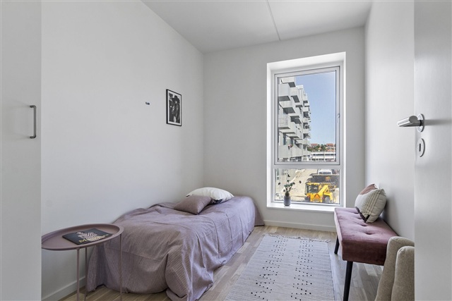 Each apartment features a spacious kitchen and dining area that seamlessly connects to the living room, creating a natural setting for social interaction and daily living.The residential community, known as Havebyen, offers apartments ranging from two to five rooms. The variety in floor plans caters to diverse preferences and age groups, ensuring suitable options for everyone. Common to all these homes is an efficient layout complemented by private access to either a terrace, balcony, or rooftop terrace. Every unit is equipped with a well-designed kitchen from Invita, complete with all necessary major appliances. This kitchen area opens directly into the main living space. The bathrooms are generously sized, featuring large shower stalls and fitted with Siemens washing machines and dryers. Wood parquet flooring is laid throughout the bedrooms and living rooms, while tiled floors with underfloor heating are found in the bathrooms. Additionally, each apartment includes a storage room within the unit itself.