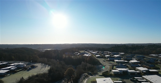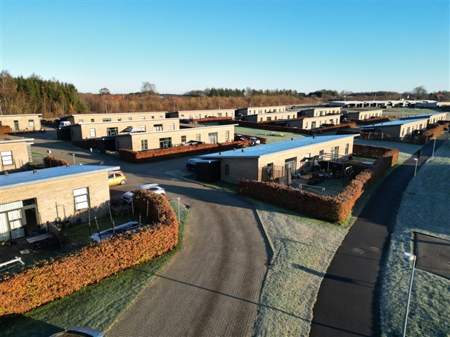 The floor plan is straightforward and functional: each home features a spacious kitchen and living area with vaulted ceilings, allowing natural light to enter from two directions. In addition, they offer three bedrooms, a large bathroom, and a utility room. Each property includes a small private garden equipped with terraces both at the front and rear, as well as an outbuilding. Parking space for two cars is available in the driveway. Constructed on a single level, these residences cater to all age groups. Overall, these homes combine family-friendly and senior-friendly design with durable, quality materials, all situated near the town and motorway yet within a peaceful neighborhood, offered at a reasonable price.The location is convenient, positioned close to schools, childcare facilities, and shopping options. Safe bike paths connect residents to all necessary destinations, including a direct route into Silkeborg. Easy access to the motorway adds to the site's connectivity.