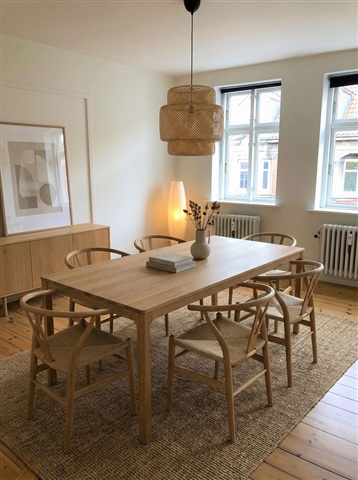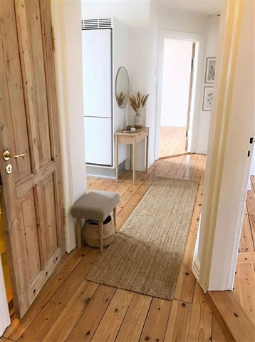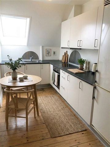 This inviting 3-room apartment spans 78 m² and features a practical layout with a bright and serene atmosphere throughout. The home is characterized by continuous plank flooring, white-painted walls and ceilings, as well as spacious and well-lit rooms that provide flexibility in furnishing, making it perfect for couples, roommates, or students seeking extra space.Upon entering, there is a hallway offering natural room for coats and shoes, leading seamlessly to the rest of the living areas. The kitchen stands out with its bright appearance, equipped with white cabinetry, a dark countertop, ample storage, a dishwasher, and an integrated oven. A large window allows pleasant natural light to fill the space, enhancing the everyday experience in the kitchen.
