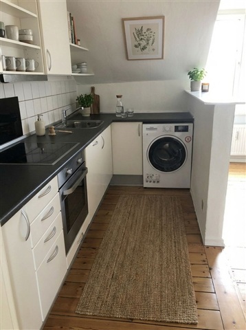 This inviting and move-in ready apartment features high ceilings, exposed beams, and bright wooden floors that together create a warm and cozy environment. Comprising four well-proportioned rooms, this home is well-suited for couples, families, or those seeking a shared living arrangement, with separate bedrooms alongside a spacious communal living area.Upon entering, you will find a hallway that provides access to a practical loft space via a ladder-perfect for additional storage or a snug reading nook. The central living room is filled with natural light streaming through skylights and features vaulted ceilings that accentuate the striking beams. Adjacent to the dining area, the kitchen presents a timeless design with white cabinetry, a black countertop, and a traditional tiled backsplash. It offers ample storage and workspace, equipped with essential appliances such as a dishwasher, oven, fridge-freezer, and washing machine.