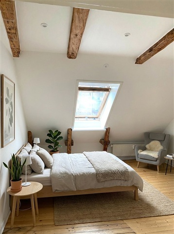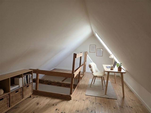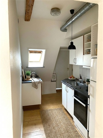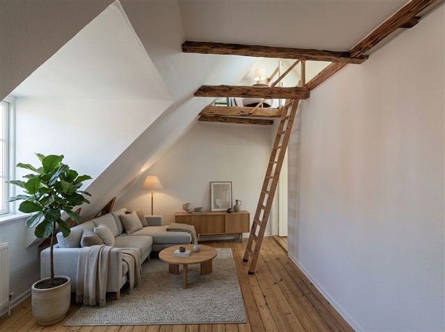 This inviting attic apartment spans 46 square meters and features two rooms accentuated by exposed wooden beams, skylights, and elegant plank flooring that together create a warm and welcoming environment. The layout is straightforward and practical, comprising an entrance hall, a living room with a loft, a separate bedroom, a compact kitchen, and a bright bathroom.The living area benefits from high ceilings that enhance the sense of space, while natural light streams in through the skylight windows. A fixed wooden ladder provides access to a generous loft area above, offering versatile extra space suitable for a sleeping loft, a cozy reading nook, or storage, depending on your needs. Throughout the apartment, the plank floors with their natural patina add distinctive character.