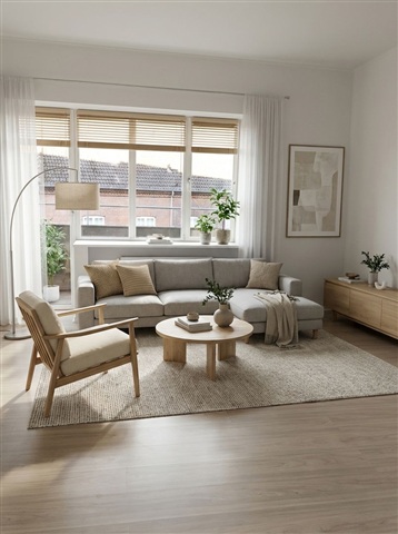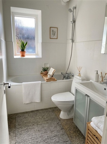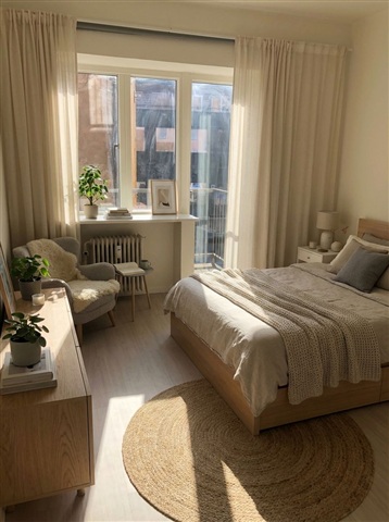 The bedroom is bright and serene, accommodating a double bed, dresser, and possibly a small desk or reading nook. Its large window and the light-toned materials contribute to a soothing atmosphere that encourages relaxation. The bathroom is well-maintained and practical, equipped with a window, a shower arrangement over the bathtub, a white washbasin with storage, and a simple yet timeless design suited for everyday use.