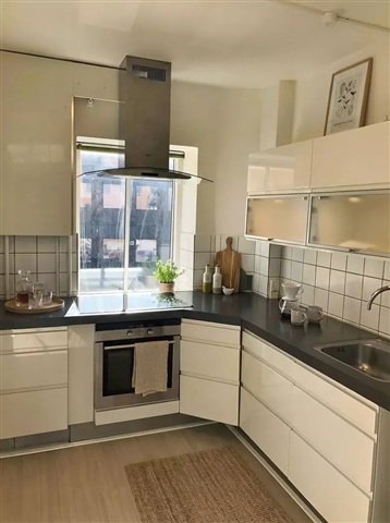 The kitchen is designed in a U-shape and features white cabinetry complemented by a dark countertop. White square tiles cover the walls, while integrated lighting under the upper cabinets enhances functionality. It includes generous storage and counter space alongside built-in appliances such as a dishwasher, oven, stove, extractor hood, and a large fridge-freezer.