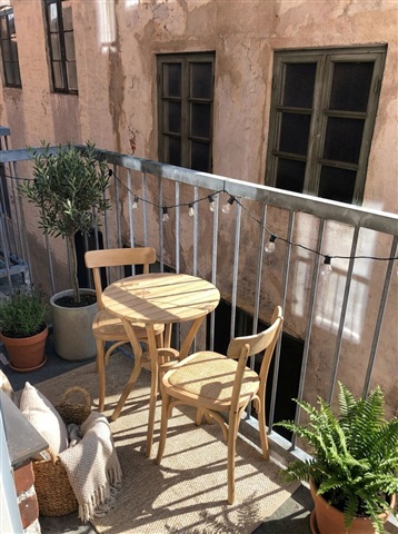 Accessible from the apartment is a balcony spacious enough for a small café table and some greenery.