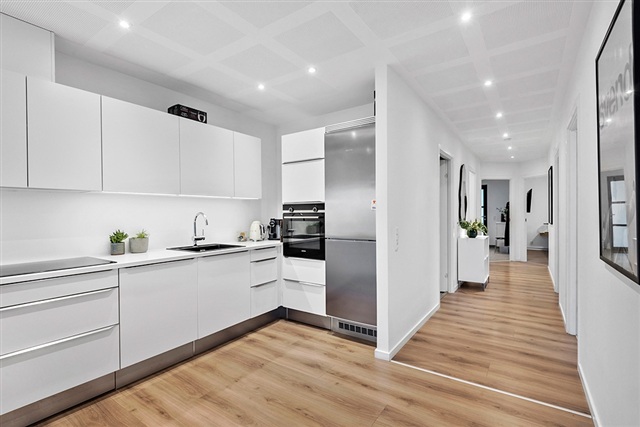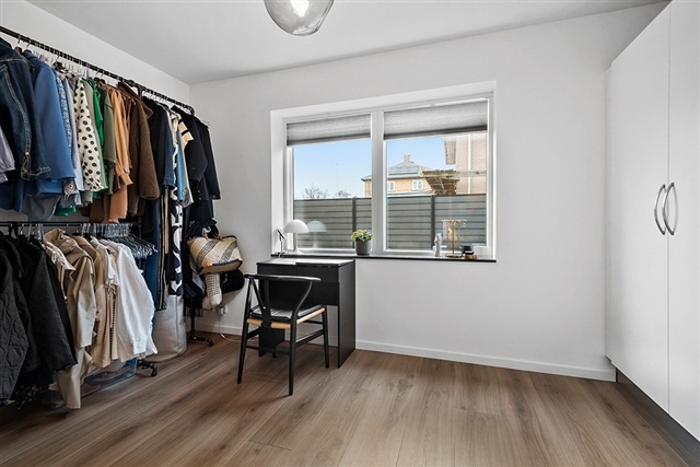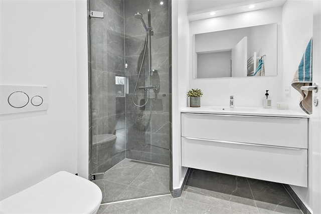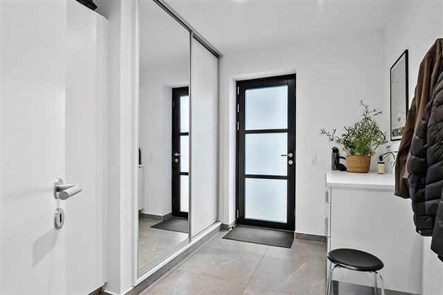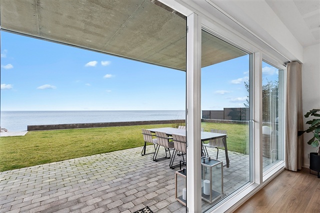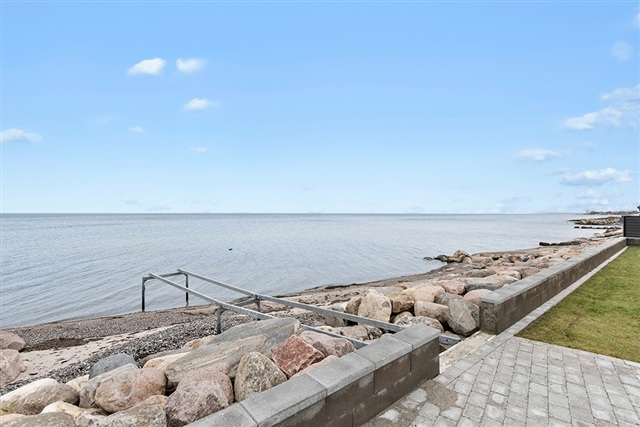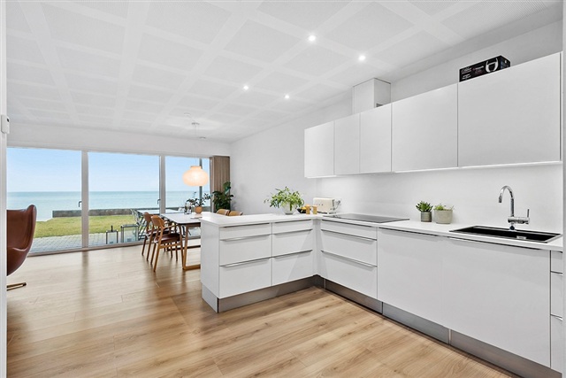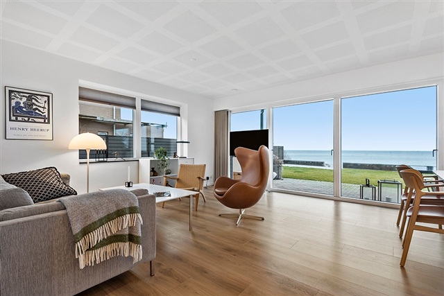 If living with a sea view and having private access to your own bathing jetty appeals to you, this distinctive apartment within the exclusive development VANDKANTEN might be just what you are looking for. Completed in 2022, the building houses only five apartments, ensuring a peaceful and private setting directly facing Køge Bay.Spanning 115 square meters, the apartment offers a spacious living room featuring striking panoramic views and direct access to a large terrace. The kitchen is open-plan, finished in white, and equipped with all modern appliances. There are three bedrooms, each fitted with built-in wardrobes. Two stylish bathrooms include showers, while the combined entrance and utility room contains laundry facilities. Additional amenities include a private heated storage room, two designated parking spaces, and guest parking availability. The property also benefits from a communal garden with a lawn stretching toward the water, along with direct access to the building's private bathing jetty.