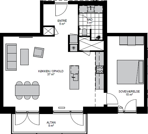 This layout caters to those seeking spacious living with an efficient use of square meters, emphasizing an open and bright kitchen-dining area that opens directly onto a private terrace. Additionally, the apartment features a generous entrance hall and a bathroom. The kitchen is equipped with a kitchen island that includes an integrated sink, along with a full set of built-in appliances. The combined living and dining space offers ample room to arrange both a lounge area and a dining setup comfortably. The bedroom is also sizable and comes with built-in wardrobes.
