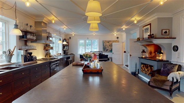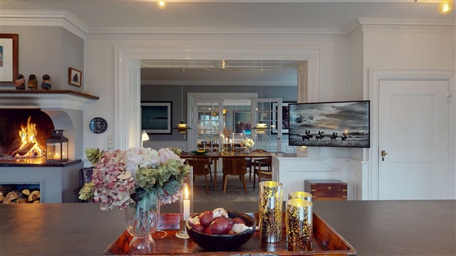 Upon entering the residence, one is immediately struck by a grand and impressive atmosphere. The spacious kitchen serves as the heart of the home, seamlessly blending practicality with refined design. This space features an elegant built-in fireplace that adds both warmth and distinctive character, while there is also ample room for a beautiful grand piano. This arrangement establishes a near-salon ambiance, well suited for intimate evenings as well as larger social gatherings.Moving on from the kitchen, you arrive at the exquisite dining room, which comfortably accommodates a long dining table for hosting substantial dinners. This area is designed to foster togetherness and offers an elegant setting to bring family, friends, and guests together. Adjacent to the dining room, a welcoming TV lounge provides a more relaxed environment, and just beyond lies a separate office space-ideal for remote work, business activities, or quiet concentration. The ground floor is completed by a stylishly appointed bathroom.