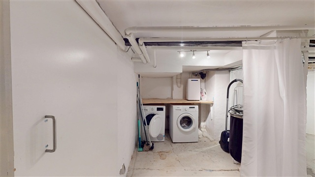 Descending the stairs from the living room leads to the expansive basement space, presently used as a bedroom, as shown in the photographs. This versatile area is equally well-suited to be transformed into an office, guest room, hobby space, or a spacious walk-in closet, tailored to the resident's requirements. The basement also includes a practical setup for a washing machine and dryer, ensuring a fully functional and private laundry routine without the need to share facilities.