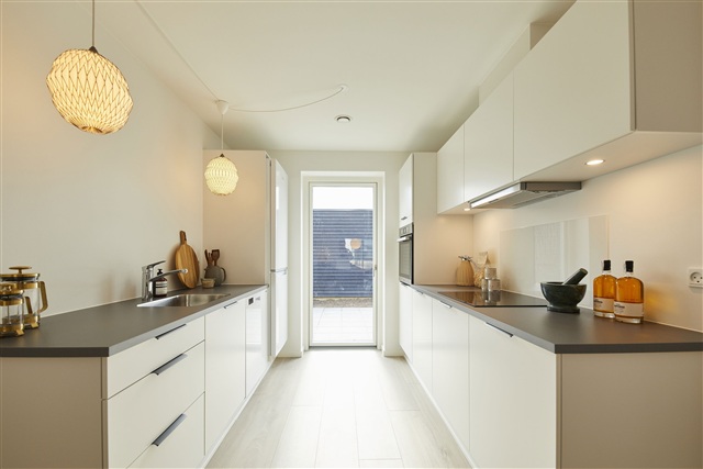 This inviting three-bedroom terraced house offers 95 m² of well-designed living space where architectural style meets practical functionality. Situated in a peaceful neighborhood, the property features a thoughtful floor plan that harmoniously blends indoor and outdoor living. The centerpiece of the home is the spacious kitchen and living area, where large windows flood the rooms with natural light, creating an open and comfortable environment. The kitchen is equipped with integrated appliances and ample countertop space, making it suitable for everyday cooking as well as entertaining guests.From the main living area, access to terraces on both sides of the house allows for enjoyment of sunlight throughout the day, from morning until evening. The property includes a generous master bedroom with built-in wardrobes, along with an additional room that can serve flexibly as a child's bedroom, home office, or guest room. The modern bathroom is conveniently located adjacent to the utility room, which houses laundry facilities prepared for a washer and dryer brought by the tenant, along with storage options.