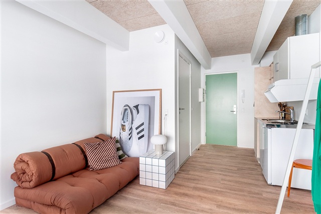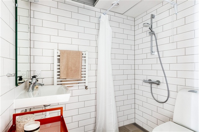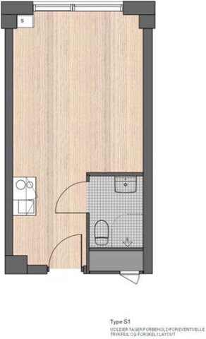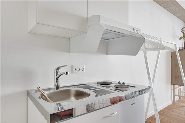 In Valby, this inviting one-room apartment spans 45 square meters, offering ample space to accommodate both sleeping and living areas. Its large windows allow plenty of natural daylight to fill the rooms, creating a bright and comfortable environment.The kitchen comes equipped with essential appliances, including a combined refrigerator and freezer, a cooking hob, and a ventilation hood. The bathroom is tastefully designed with a combination of white and cream tiles, providing a fresh and elegant appearance.