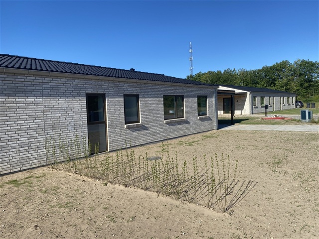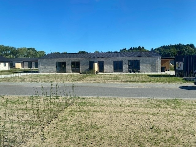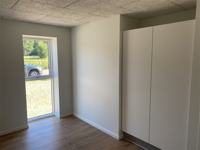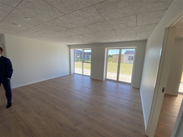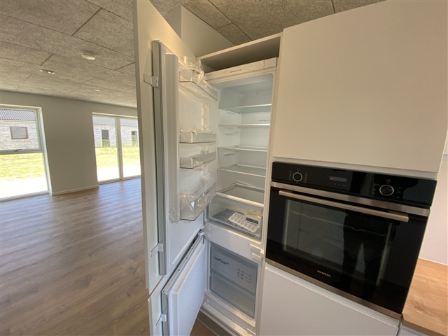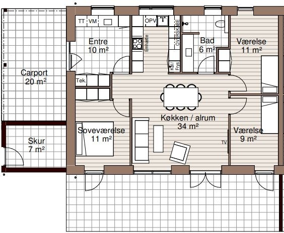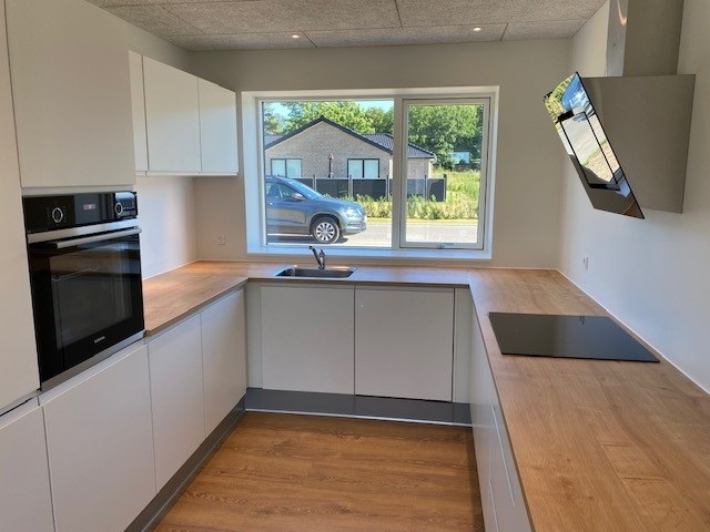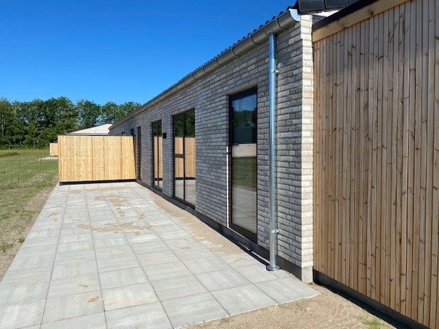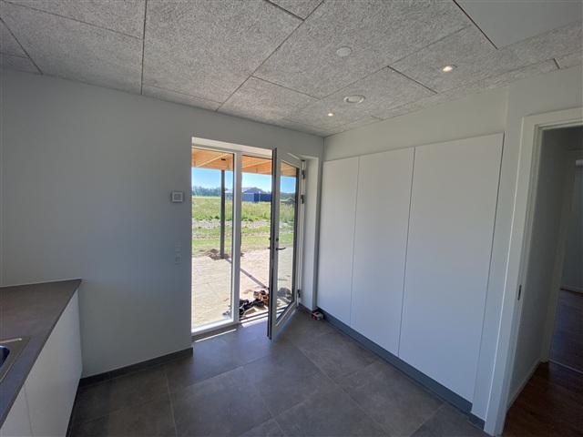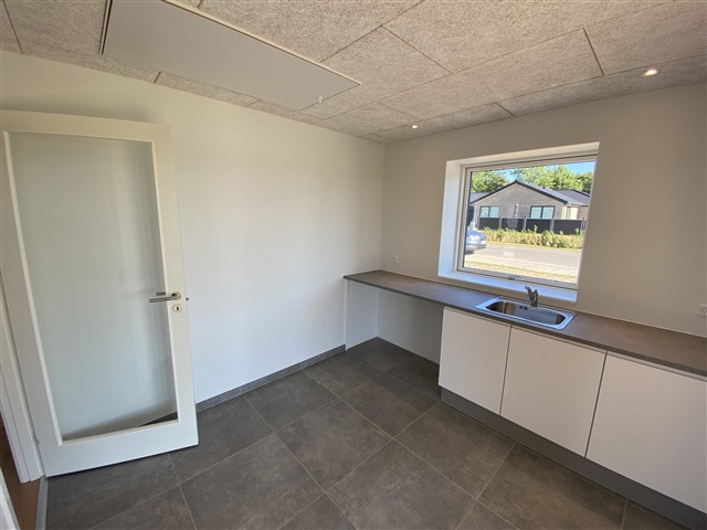 The practical utility room doubles as the entrance area, equipped with a washing machine, dryer, and sink. This entryway grants direct access to the home's core: the expansive kitchen-living room. From this area, a door leads out to the paved terrace in the garden, establishing a seamless transition between indoor and outdoor living.