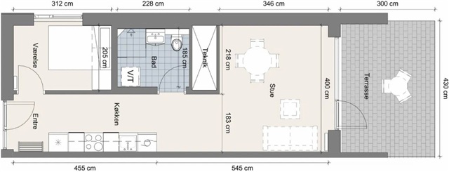This two-room residence features a bedroom facing the atrium garden and an open-plan kitchen and living area that opens onto a private outdoor terrace. The kitchen is a custom-made Danish design from Stykka, crafted from lacquered birch plywood, which harmonizes elegantly with the flooring, window frames, and wooden elements found in the atrium. The bedroom is similarly equipped with bright, bespoke furnishings from Stykka, including a bed and a storage unit. Upon entering, you are greeted by a high-quality built-in bench of the same craftsmanship. The apartment also includes a spacious, light-filled bathroom with underfloor heating and room for a washer-dryer stack. Adjacent to the atrium garden is a small forecourt where one can enjoy morning coffee in close proximity to communal greenery and the community atmosphere. This space invites personalization with a few pots, a narrow bench, or a small metal café set.Constructed with environmental awareness, Roberthaven features both timber facades and load-bearing structures aimed at minimizing the climate impact. The heating is provided by an air-to-air heat pump, among the most efficient and sustainable options available. Since the heat pump runs on electricity, the monthly advance payment for electricity covers heating, cooking, lighting, and general household energy consumption. The dwelling comprises an entrance with a custom-built bench, a bathroom with space for a washing stack, a bedroom furnished with bespoke bed and storage units, a Danish custom kitchen with integrated dishwasher, a living room opening onto a private terrace, and a private storage room at ground level.