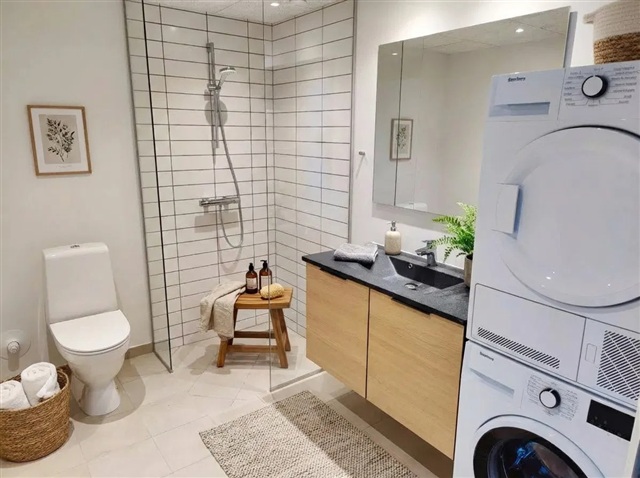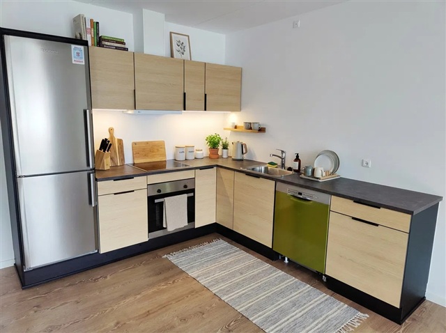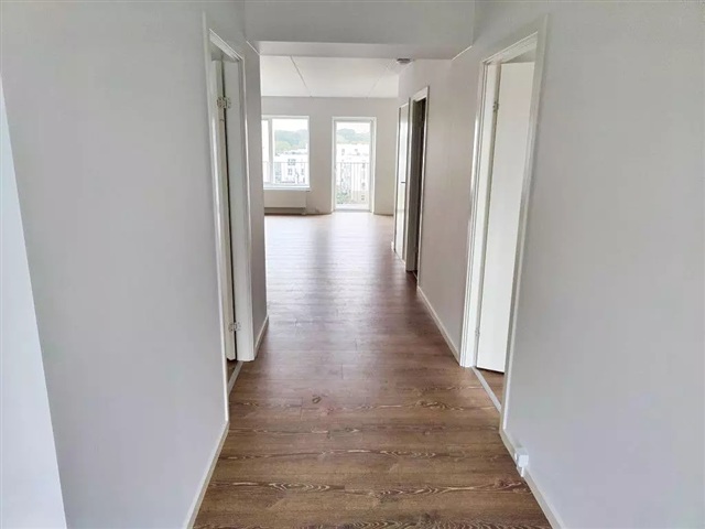 This apartment offers a blend of brightness and high-quality finishes, ready for immediate occupancy and boasting a pleasant ambiance throughout. Located on the top floor, the residence features expansive windows that flood the space with natural light. The kitchen and living area are combined in an open layout, fostering a welcoming environment suitable for everyday living as well as social gatherings. A private balcony provides a lovely view over the city, perfect for enjoying your morning coffee.Situated within the Downtown Apartments Hjørring complex, the building stands out as one of the most sought-after addresses in the neighborhood. Residents benefit from convenient features such as an elevator, a video doorbell system, and access to a communal rooftop terrace. This outdoor space includes seating areas and an herb garden, offering opportunities for both relaxation and social interaction.
