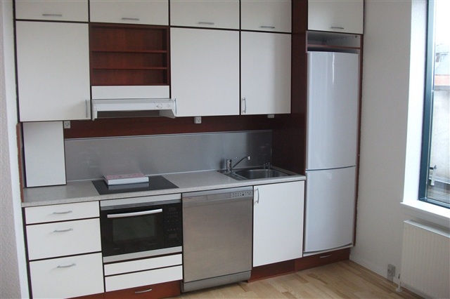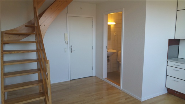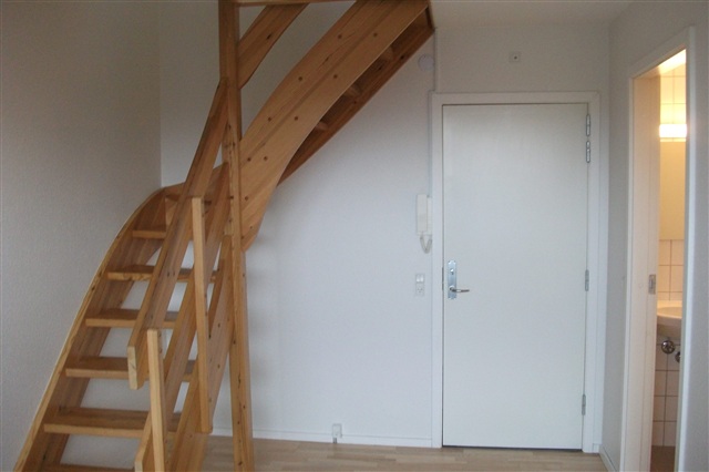 A one-bedroom apartment located on H. N. Clausens Gade in central Aarhus is now available for rent.This charming unit offers a total area of 61.9 square meters. Inside, you will find a well-equipped kitchen complete with a refrigerator, stove, and ample cabinet storage. The living room features a unique two-level layout connected by an internal staircase, where the upper floor can be utilized as a sleeping area if desired. Situated on the fourth floor, the apartment also includes access to a private balcony.