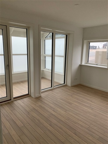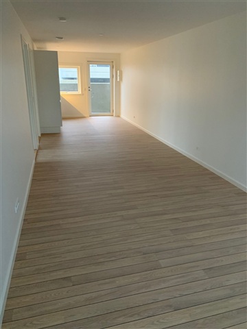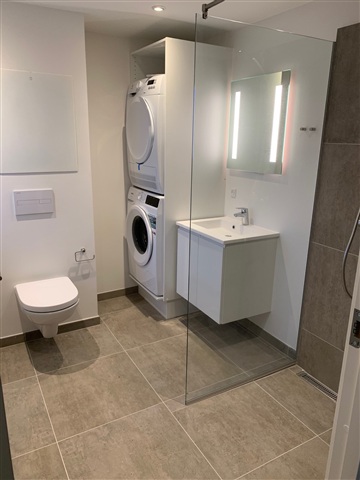 All essential appliances are included, such as a washing machine, tumble dryer, extractor hood, dishwasher, induction cooktop, oven, and a fridge-freezer unit. Throughout the apartment, attractive light-colored ship plank flooring has been installed, except for the bathroom, which is fitted with large concrete-look tiles. The bathroom also contains a shower enclosure and a built-in toilet. All plumbing and electrical installations are brand new, and the walls throughout the apartment are smooth and painted white.