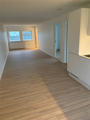 Situated in a recently refurbished building in one of Hjørring's most sought-after locations, this bright and spacious apartment is just a short stroll from the Metropol shopping center and the pedestrian street.This residence features two bedrooms, each equipped with closets, along with a bathroom and an open-plan kitchen and living room combined into one generous space. The kitchen, designed by Designa, boasts handleless white lacquered cabinets and a compact laminate countertop with an integrated sink.