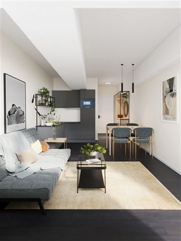 This well-lit and generously sized studio apartment offers 36 square meters of living space. The kitchen is designed with a modern touch, highlighting elegant rustic shades, and is fully equipped with a fridge/freezer combo, dishwasher, extractor fan, cooking hob, and microwave.Within the apartment, there is adequate room for a compact dining area alongside either a bed or a sofa, depending on individual preferences. The bathroom complements the space with its clean and bright aesthetic, including a separate shower area.
