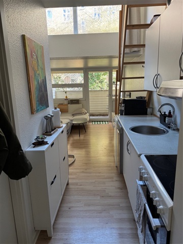 This centrally located one-room apartment on Bissensgade in Aarhus offers a well-designed living space complete with a mezzanine and a balcony, situated away from the street noise.The accommodation features a bright kitchen equipped with a stove, fridge-freezer, and extractor hood, along with ample storage options. Adjacent to the kitchen is the living area, which can be easily furnished with both a sofa and a dining table. The balcony faces south, providing a pleasant outdoor space.