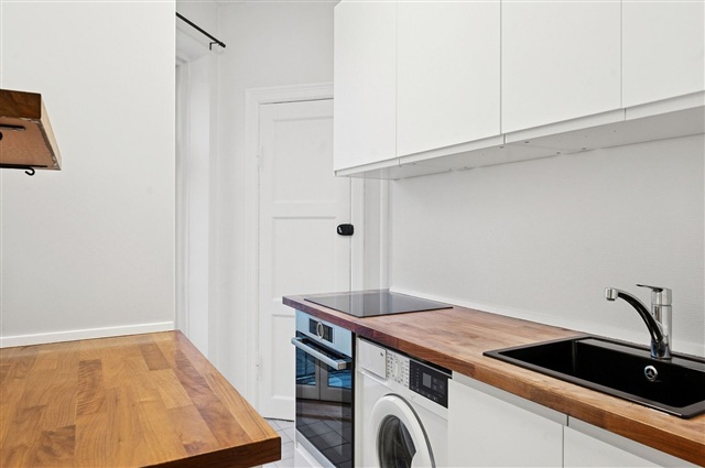 The apartment also features a large balcony, offering an extra living space during the summer months. There is plenty of room for a café table, plants, and cozy evenings in the sun. The balcony is a clear bonus if you appreciate outdoor space in the middle of the city.