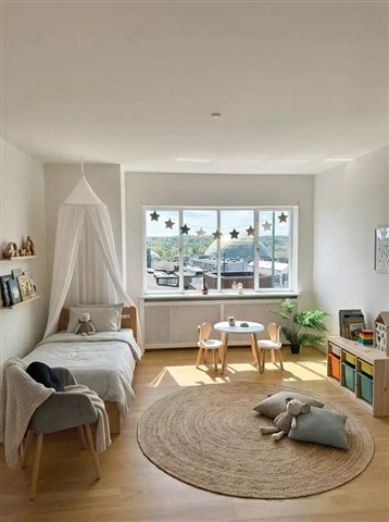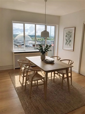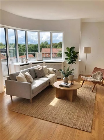 This spacious 4-room apartment covers 122 square meters and features large windows, light wooden floors, and a carefully planned layout that together create a welcoming and comfortable environment. The layout ensures generous space filled with natural light, complemented by two balconies that invite outdoor living to become a natural part of the home.Upon entering, a hallway leads to a central corridor that connects the various rooms of the apartment. The generously sized living room is distinguished by a wide, curved window section that floods the space with daylight and offers pleasant views over the rooftops of the city as well as the surrounding greenery. Adjacent to the living area is a large room currently set up as a dining area, though it can easily serve as an additional bedroom or a functional home office depending on your needs. From the living room, there is access to a rounded balcony, providing enough room for a table and chairs-ideal for enjoying time outdoors in a relaxed setting.