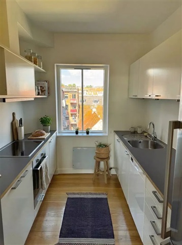 Within the property's courtyard, residents have the option to register for a parking space, which includes access to an electric vehicle charging station. The neighborhood is lively and offers a variety of cafés, bars, and take-away options, as well as a broad selection of shops, grocery stores, and fitness facilities nearby.