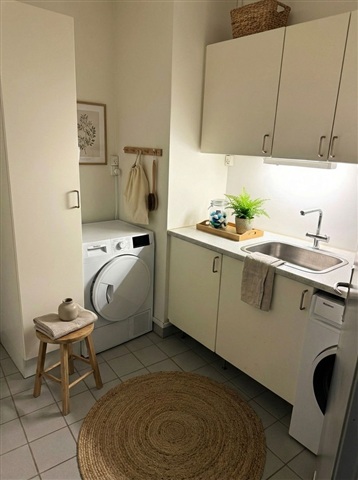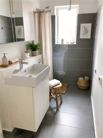 The bathroom is bright and well-maintained, decorated with grey floor and wall tiles, a separate shower enclosure with a glass partition, a window for natural ventilation, and a practical sink with storage beneath. Additionally, the apartment benefits from a private utility room that provides excellent storage capacity along with a washing machine and dryer, simplifying daily chores.