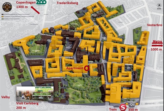 300 m to Carlsberg S-train station (9 min. to Copenhagen Central Station).