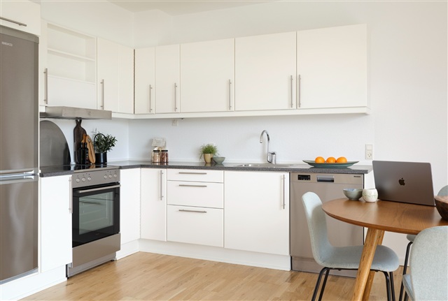 Klosterparken is carefully designed to foster social interaction among friends, family, and neighbors through its outdoor spaces. Maintenance of the communal areas is managed by a skilled service team that ensures cleanliness and order, allowing residents to fully enjoy the beautiful surroundings. The building itself is arranged in a horseshoe shape with an outer and inner ring, and parking is conveniently located around this formation, ensuring that residents can park close to their homes. Across Klosterparken's 312 apartments, sizes range from 69 to 125 square meters, with layouts offering two to four rooms. These residences are available on one or two levels and come with balconies or gardens suitable for peaceful outdoor moments.
