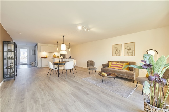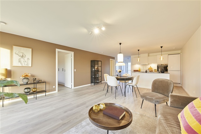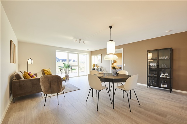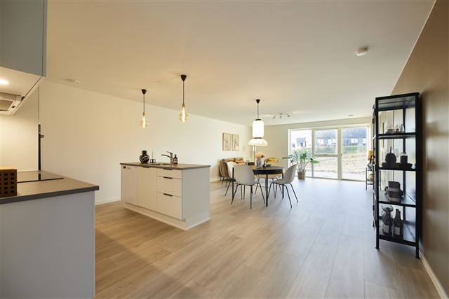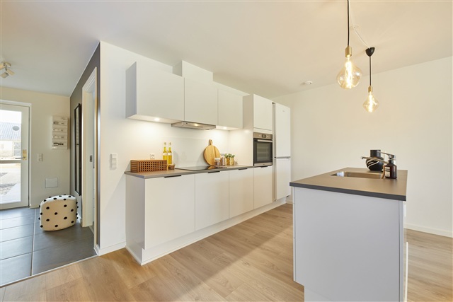 This well-designed townhouse, situated on Gadekæret, offers 105 square meters of living space distributed over four rooms. The residence is bright and contemporary, providing ample room suited for both family life and quiet everyday moments. The layout has been carefully planned to maximize usable space while ensuring functional and practical solutions throughout.Entering the home, you step directly into a spacious open-plan kitchen and living area. This central part of the house benefits from large windows that flood the space with natural light, accommodating both a dining area and a comfortable seating zone. The kitchen features sleek white cabinetry complemented by a rustic slate-look countertop and is equipped with built-in high-quality appliances including a fridge/freezer, dishwasher, induction cooktop, extractor hood, and a pyrolytic built-in oven. From the living room, there is direct access to one of the two private terraces as well as the enclosed garden.