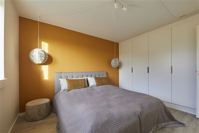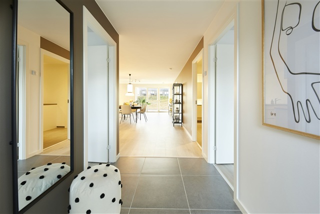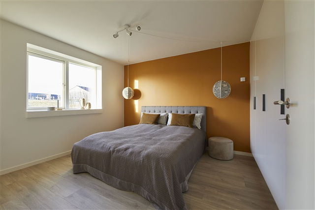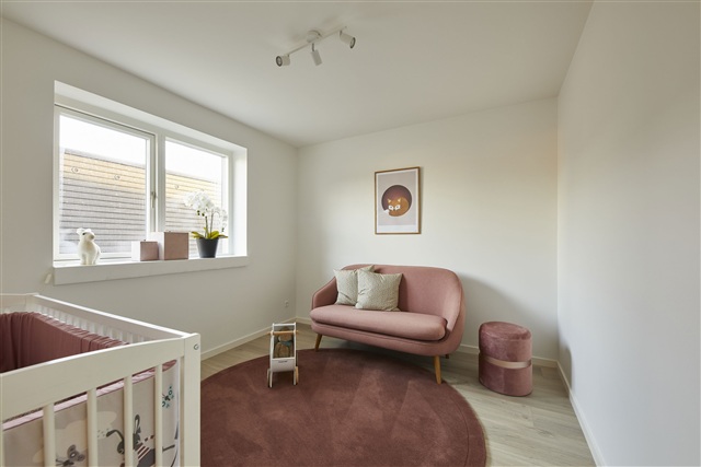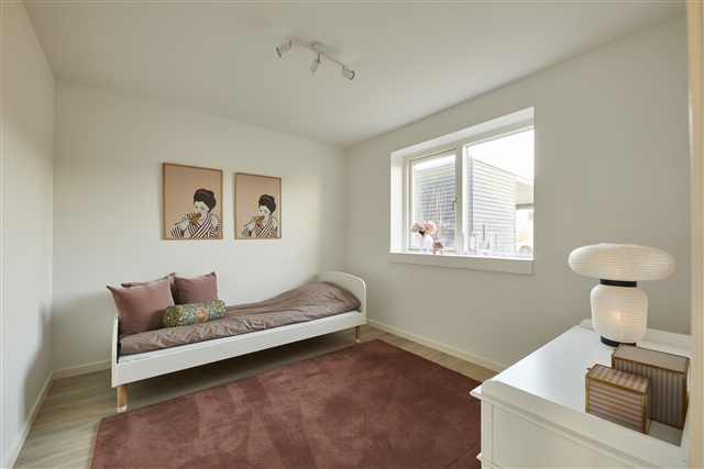 Constructed with light and timeless materials, the home features oak plank flooring in the living spaces and bedrooms, while tile flooring has been laid in the entrance, utility room, and bathroom. Underfloor heating is installed throughout all rooms, controlled individually by thermostats, and a ventilation system ensures a healthy and comfortable indoor climate.