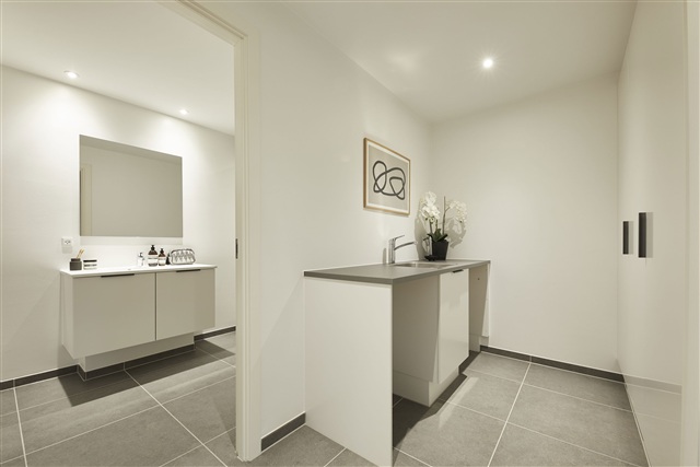 Practicality extends to the utility room, accessible from the kitchen/dining area, which houses laundry facilities, technical installations, and space for a washing machine and dryer (to be provided by the tenant). Adjacent to this is a modern bathroom fitted with light-toned fixtures, a wall-mounted toilet, and high-quality fittings.
