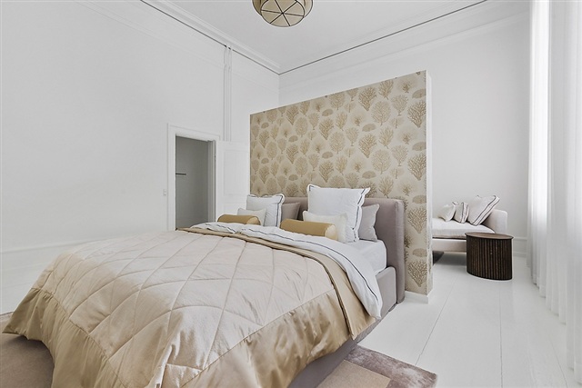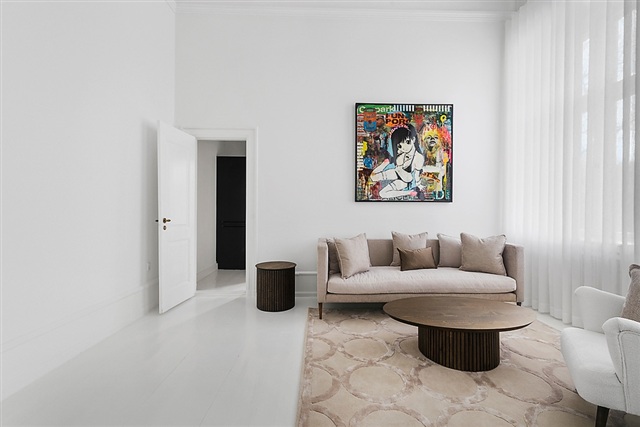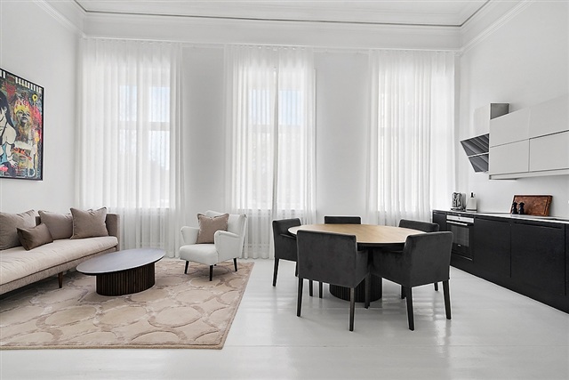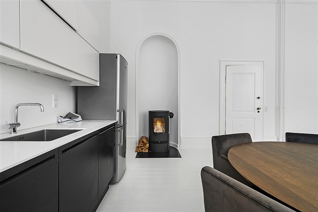 This distinctive apartment is situated on the ground floor of Gurrehus Slot and is one of six residences within the castle. It features exceptional ceiling heights, abundant natural light from tall windows, and comes fully furnished in a luxurious style, ready for immediate occupancy. Upon entering, you step directly into the living area where a wardrobe is conveniently located. The space immediately impresses with its over four-meter-high ceilings and generous daylight. The open-plan layout combines the kitchen, dining, and living zones seamlessly, and the modern kitchen is equipped with all necessary appliances.The spacious bedroom is designed with a double-sided bed featuring a headboard that divides the room, providing ample space for a dressing area and direct access to a walk-in closet. The bathroom is generously sized, modern, and elegant, including built-in storage cabinets adjacent to it. Residents of this apartment benefit from a well-maintained shared outdoor area on the castle's lawn, suitable for outdoor furniture and barbecues. Additionally, the rental includes access to a private parking space and shared laundry facilities located in the basement. The apartment is not available for shared housing arrangements. Utility costs are not included in the rent, and there is an option to rent the property unfurnished subject to agreement.