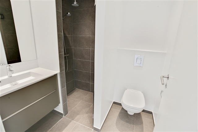 Built in 2015, this townhouse showcases light parquet flooring throughout and features sleek, gray tiles in both the bathroom and the toilet, embracing a modern and timeless aesthetic.