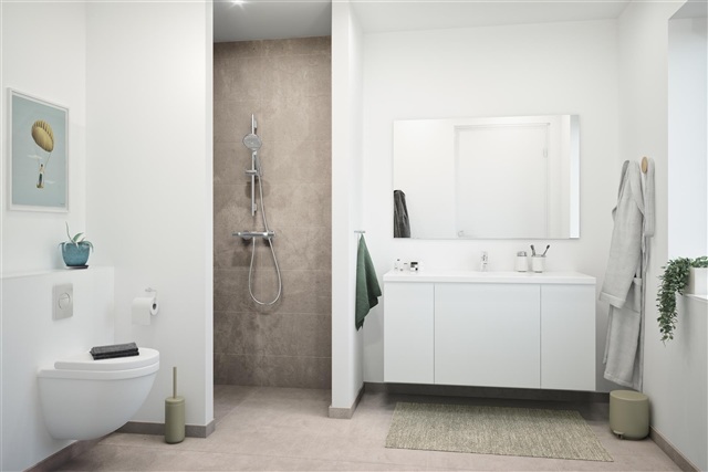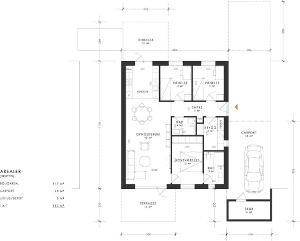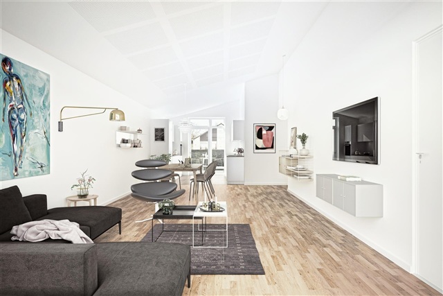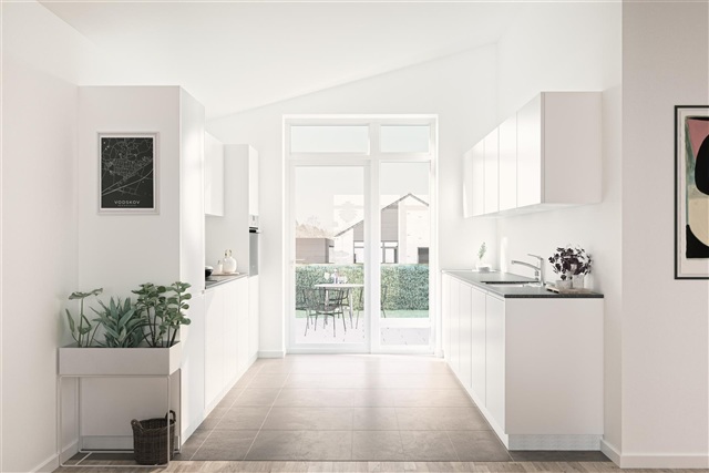 The house's large living/dining room has an open connection to the kitchen and pitched ceilings. There is a fantastic amount of light throughout the house and access to both sides of the house's 2 beautiful terraces. With a spacious bedroom of 13 sqm and an attached bathroom, as well as 2 large rooms of 9 sqm, this house type is very suitable for a young family, as well as for seniors, who can have space for both a study and a guest room.