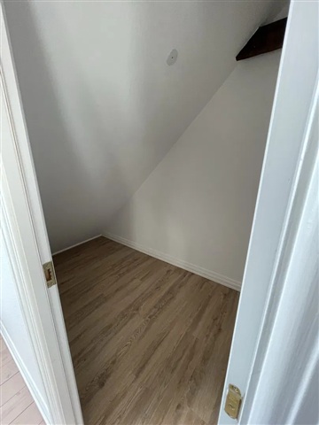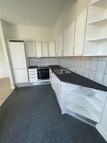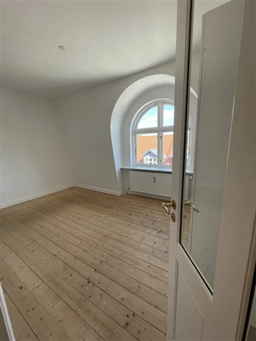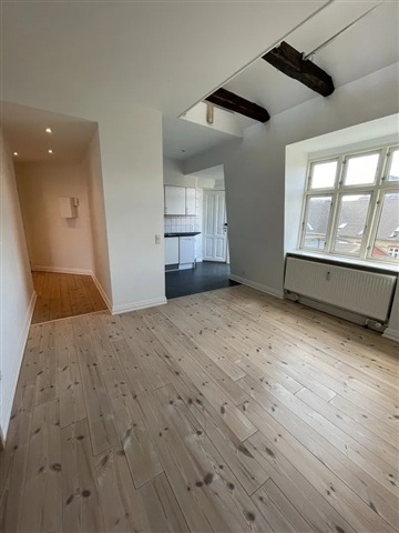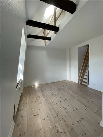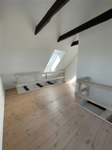 This apartment offers a bright living space imbued with the vibrant energy of the city, ready for immediate occupancy and well-suited for one or two residents seeking a central location. The interior features polished, oiled plank flooring and exposed ceiling beams that add personality while enhancing the open and airy atmosphere of the living room. Adjacent to this area lies a timeless kitchen equipped with an induction cooktop, built-in oven, and a combined washer and dryer unit. From here, sliding doors lead out to a sunny, south-facing balcony outfitted with wooden decking and a steel railing, providing a pleasant spot to enjoy morning coffee while overlooking the rooftops of Aalborg.The bedroom is designed with versatility and tranquility in mind, highlighted by a beautifully curved window that invites an abundance of natural light. The bathroom is neatly tiled and includes a separate shower enclosure along with cabinetry for convenient storage and low-maintenance upkeep. A fixed wooden staircase ascends from the living area to a furnished loft space featuring a skylight, ideal for use as a home office or guest zone, with an additional room dedicated to storage needs.