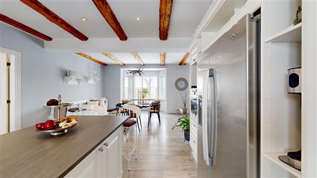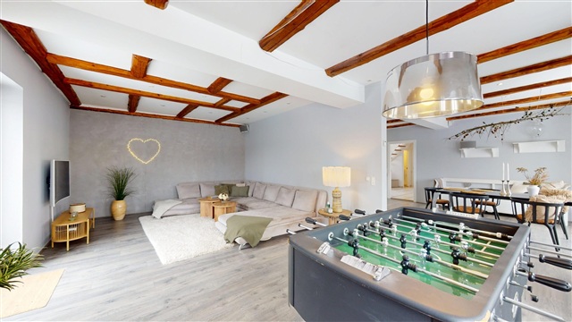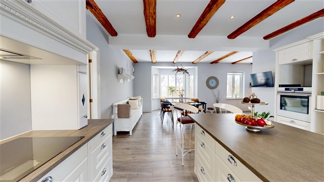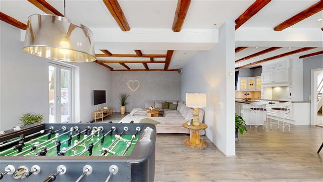 At the heart of the house is the spacious open-plan kitchen and dining area, where natural light and generous proportions make a striking impression. The space comfortably accommodates a large dining table, making it ideal for both everyday living and special occasions. The kitchen itself is elegant and high-end, featuring quality materials, abundant cabinetry, and optimal workspaces-an ideal setup for any culinary enthusiast. A smooth transition leads into the roomy living room, creating a beautiful connection between the communal areas. The living area is inviting and warm, offering a perfect atmosphere for relaxation and socializing.