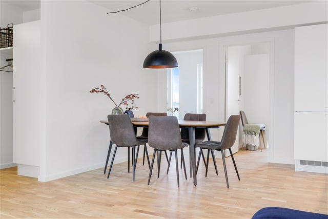 Please note that the images shown do not depict the exact rental unit.Within the residences of Elmehuset, you will find a contemporary kitchen designed by Svane, specifically the Vision model, featuring sleek white surfaces, ample cabinet space, and a stylish Grohe faucet. The apartment is equipped with high-quality Siemens appliances, including a fridge-freezer, a built-in dishwasher, a stainless steel and glass oven, as well as a four-zone induction cooktop with Touch Control. The range hood, branded Silverline, is seamlessly integrated into the overhead cabinetry.