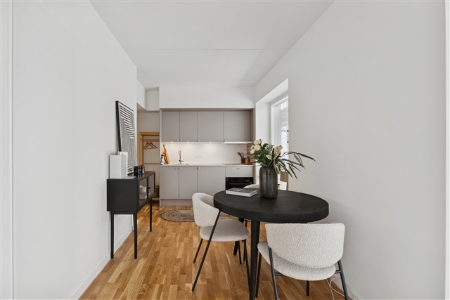 The development's Punkthuset building contains 23 well-lit two-room apartments, emphasizing functionality and current living standards. Each apartment includes a private terrace or balcony, an open living area, a separate bedroom, and large windows that flood the interior with daylight, providing a seamless connection to the outdoors. The building's location fosters a peaceful environment with a thoughtful equilibrium between privacy and community, making it especially suitable for singles, couples, and seniors who appreciate both space and quality in a lively, attractive urban setting.