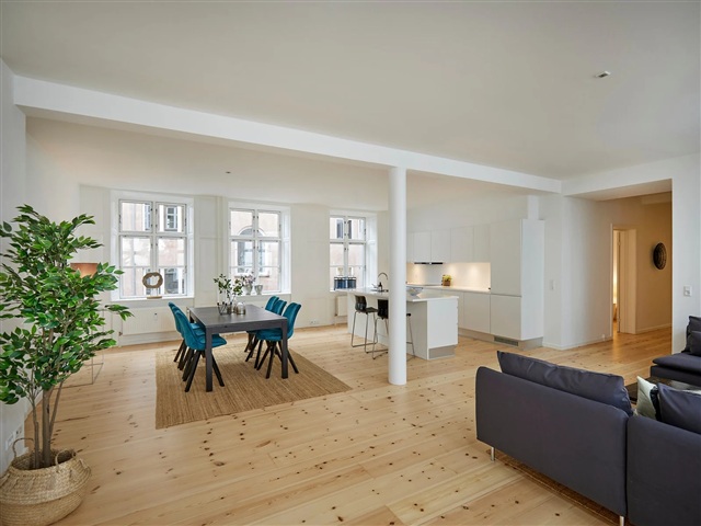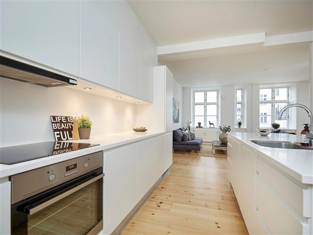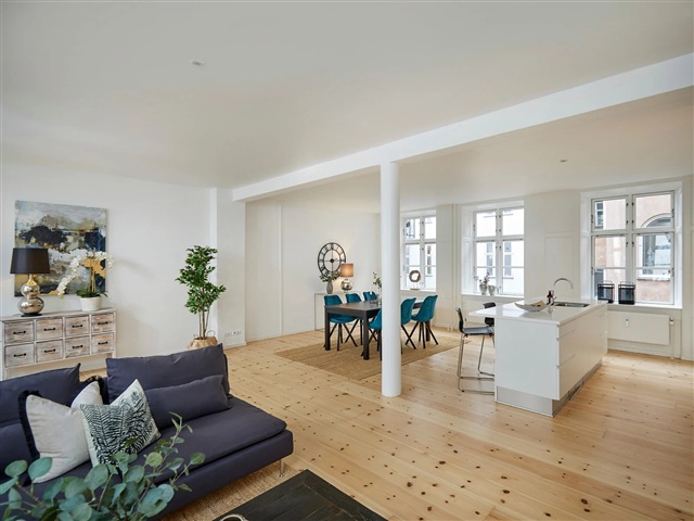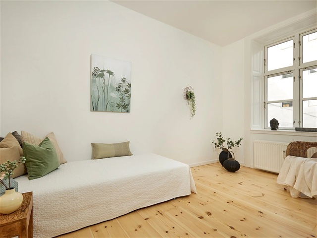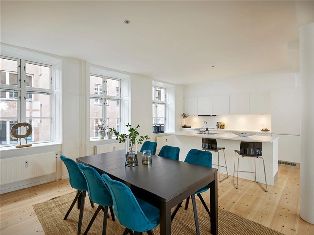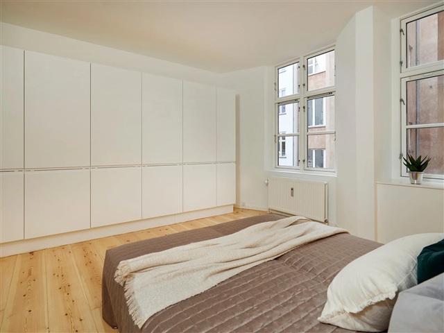 This bright and recently renovated apartment is situated on the first floor, nestled close to the Lakes in Copenhagen. Positioned in the rear wing of the building at the beginning of Nørrebrogade, the residence enjoys a tranquil setting while still benefiting from ample natural light. The property is equipped with an elevator, and each apartment includes a dedicated storage room located in the basement. The location offers convenient access to excellent shopping options, a variety of cafés and restaurants, picturesque green spaces, and Nørreport Station, providing outstanding train and bus connections, all within a few minutes' walk.Inside, the apartment features an entrance hall leading to a spacious, light-filled open-plan living room and kitchen area measuring 55 square meters, complete with all major appliances and numerous windows. The master bedroom spans 17 square meters and is fitted with six built-in wardrobes. Additionally, there are two other bedrooms, sized 12 and 8 square meters respectively. The large bathroom includes a shower enclosure along with a washing machine and dryer, complemented by a separate guest toilet for added convenience. Located within the courtyard, the apartment is accessed through the gate on Nørrebrogade.