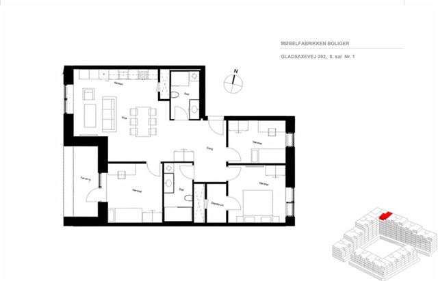 This residence has been designed with families in mind, focusing on quality, practicality, and ease of daily living. Upon entering, there is a hallway equipped with storage solutions. The bright rooms include built-in closets, while the bathroom features a combination washer and shower nook. The spacious kitchen-dining area opens onto a large balcony, providing an ideal spot to enjoy the summer months.Located in Søborg, the development known as 'Møbelfabrikken' dates back to 2019 and sits on a site with a rich industrial heritage. The original main building, constructed in 1939 for furniture manufacturing, has been preserved due to its significant cultural value. Behind it, the developer Dades has built a modern residential complex comprising 184 well-designed apartments. These homes combine a sleek aesthetic both inside and out, characterized by elegant brickwork and steel-framed windows, alongside a light and minimalist interior that allows families to personalize their space easily. The communal focus centers around a verdant courtyard inspired by New York-style urban environments, featuring areas for children's play, seating with table-bench sets, and walking paths weaving through green spaces. Bicycle parking is available within the courtyard, while residents can opt for a paid parking space in the basement. Every stairwell includes elevator access. Parking fees are set at 850 DKK for the garage and 550 DKK for surface parking.