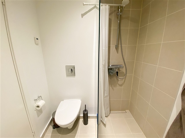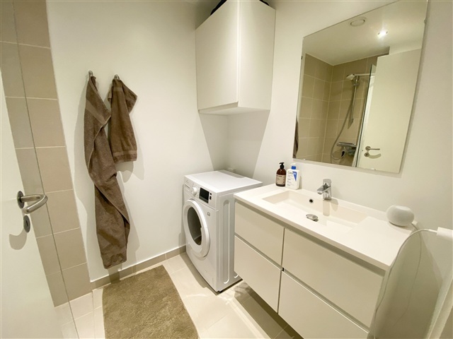 Upon entering the apartment, you step into a small entrance area designed for storing shoes and hanging outerwear. As shown in the photos, there is enough space here for a console table. From this entry corner, access leads directly to the bathroom, which is equipped with a spacious sink and connections for both a washing machine and a dryer. The bathroom also features a separate shower stall.Continuing from the entrance zone, you arrive in the kitchen-living area that includes a recently installed kitchen. This space is suitable for a small dining table as well as a modest sitting area. From the kitchen-living room, there is access to a generously sized balcony that can accommodate a small dining set along with a lounge sofa or similar furniture.